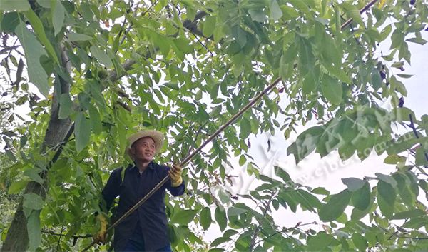 走进核桃园,老板周宗保攀爬在一棵核桃树腰上,背靠主干,正手持一根长竹竿,挥打着成熟的核桃,十多名游客则忙着在树下捡拾核桃,忙得不亦乐乎。