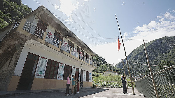 星期一的早上,田旻带领着孩子们升国旗、唱国歌。在田旻的领唱下,6个依次排列的孩子也唱得格外卖力,庄严的国歌声在水浒坪村上空回荡。
