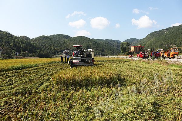 云上巴东报道(特约记者陈祥楚 摄)9月22日,巴东县金果坪乡桃李溪村,两台联合收割机正在田间来回穿梭,帮助村民收割成熟的水稻。