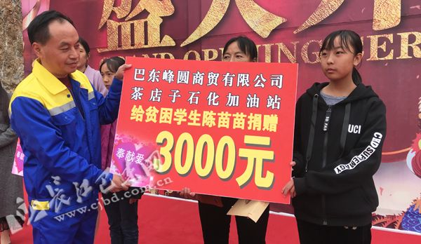 云上巴东报道(融媒体记者 王嫣然 特约记者 向启家)10月12日,巴东县茶店子镇峰圆石化商贸有限公司开展爱心捐赠活动,向巴东县慈善总会捐款2万元,并为茶店子民族中学两名贫困学生捐款6000元。