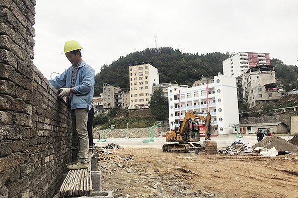 云上巴东报道(融媒体记者 严玉玲 特约记者 向启家)10月12日,在巴东县茶店子镇民族中学,工人正在加紧修建校园围墙,为校园加装“安全网”。