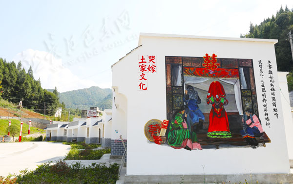 云上巴东报道(融媒体记者 赵丹 摄)10月18日,在巴东县信陵镇荷花村易迁安置点的一栋安置房墙上,一幅反映土家“哭嫁”文化的宣传文化墙格外抢眼。 据了解,该易迁点为美化环境,丰富群众的精神文化生活,营造脱贫攻坚的良好氛围,着力为居民打造美丽的文化长廊。文化宣传墙画主要以宣传土家文化为主,文明标识标志包含了社会主义核心价值观、家风家训、文明礼仪等精神文明建设内容。 (责任编辑:谭雪梅)